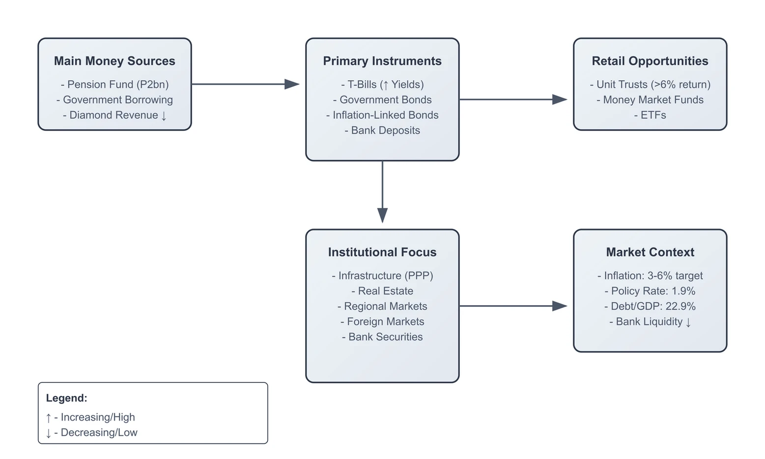 New Role for Pension Funds: Traditionally, De Beers (a major diamond company) brought in a lot of money that helped with liquidity, but with weak diamond sales, that cash flow has slowed. This means pension funds could become an important source of money for banks and the economy as they are net savers.